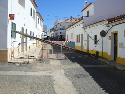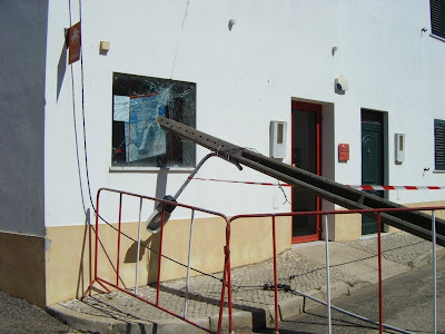 Caiu um poste de electricidade na rua 28 de Maio em Colos, e foi enfiar-se direitinho numa das janelas do edifíco dos correios: